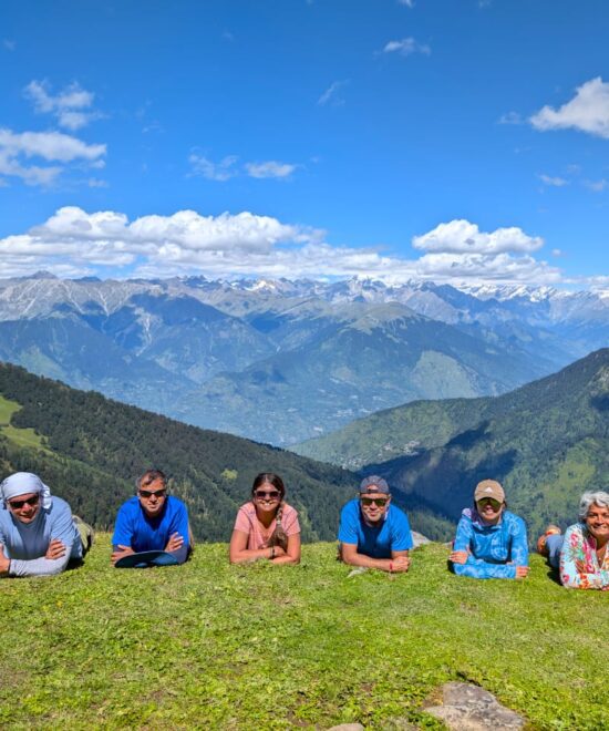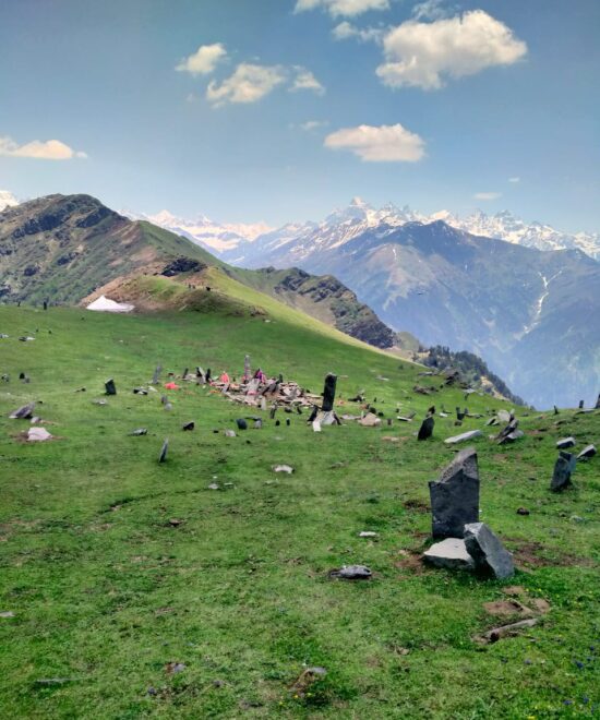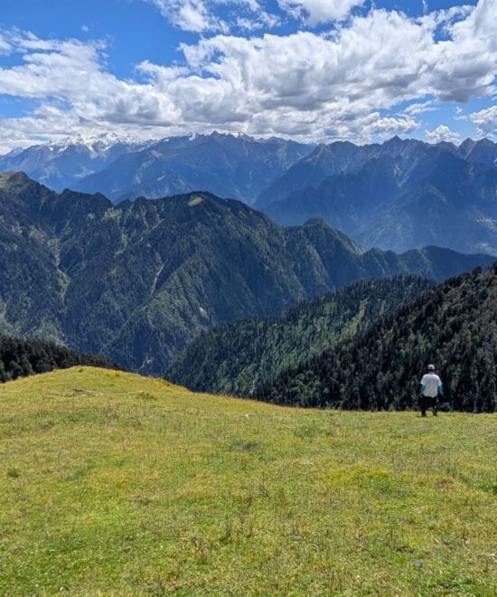 The trek offers panoramic views of the Pir Panjal, Dhauladhar, and Parvati ranges, along with lush forests, meadows, and glimpses of unique Himachali villages.