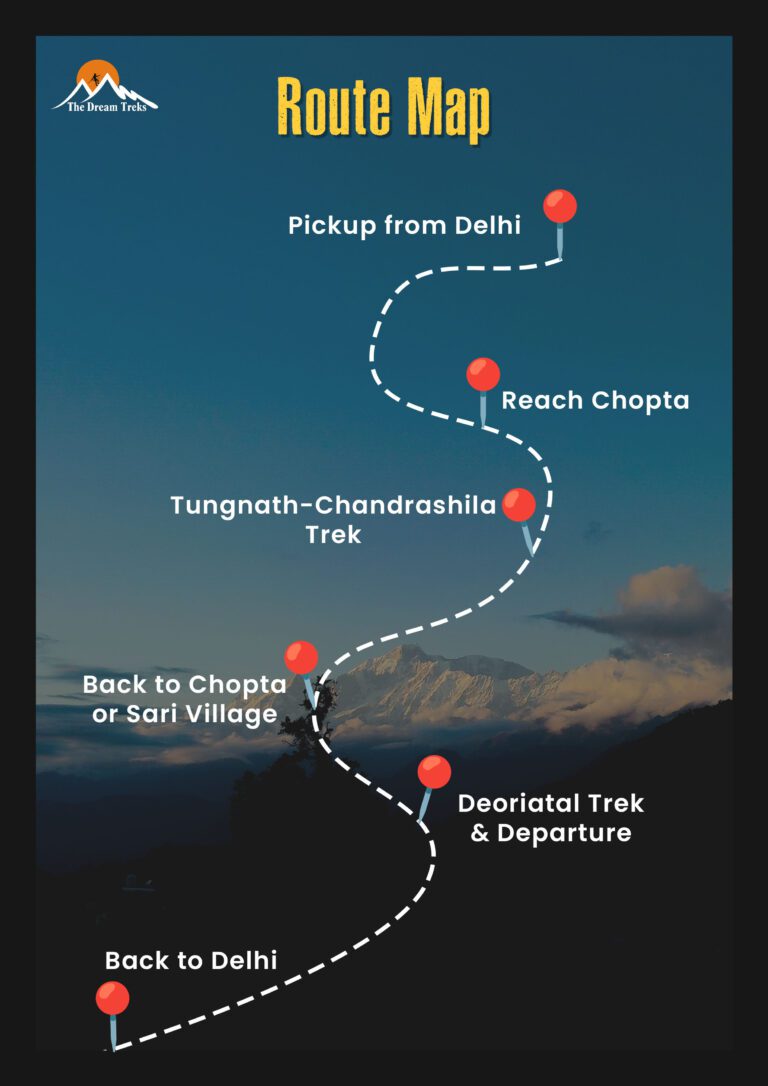 This will be the last day of your trek. After your breakfast, if you are staying at Chopta then you will embark on a short drive to Sari village, from there you will start a short hike of approximately 4 km to Deoriatal. Spend some time at Deoriatal and then return to Sari village for your drive back to Delhi. Reminisce about the journey you’ve had on the way back and reach Delhi by Early Tuesday morning (around 2-4 AM) . (Forest Permits for Deoriatal not included in the package.)